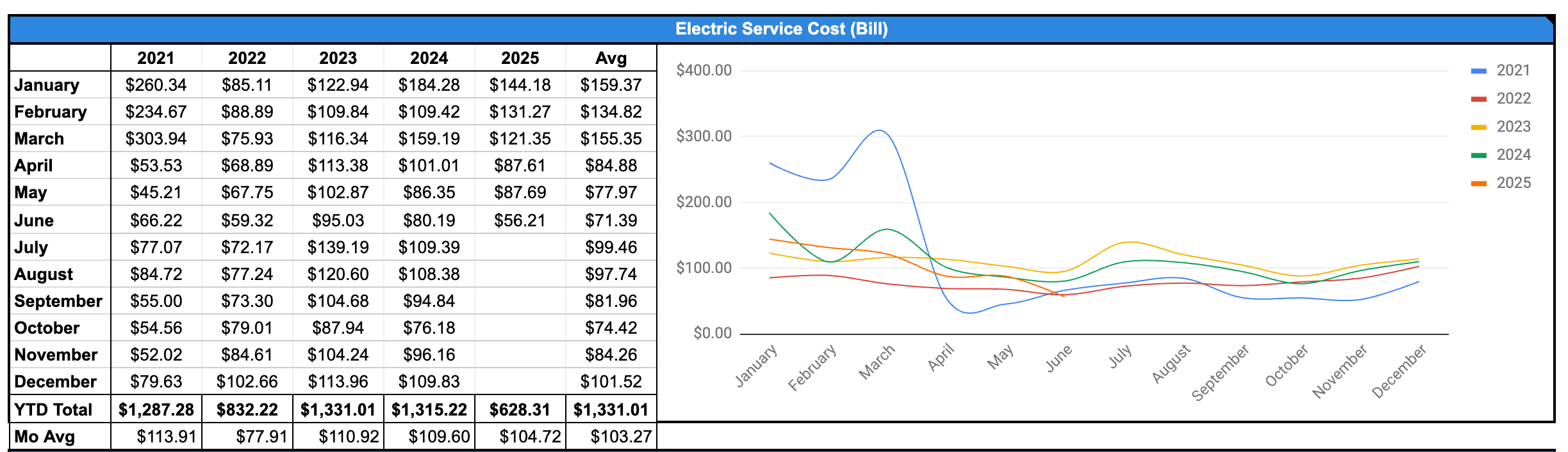 Some of those can be variable, like utilities. I found a community template that someone put together with a table of each month’s utility bills for electic, gas, and water. I modified that a little to give me an annual total and a monthly average and charted that out.