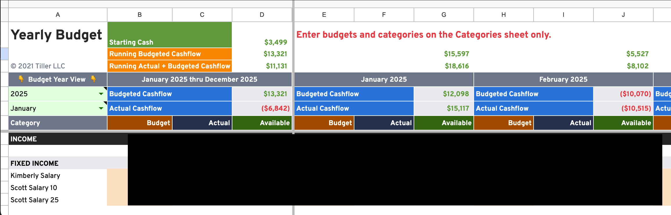 You can continue to use the Yearly Budget from the Tiller foundation sheet as long as you have the Monthly Budget sheet. If you don’t use the Monthly Budget sheet and want to save some processing power and reduce the number cells your workbook uses, you can use this.